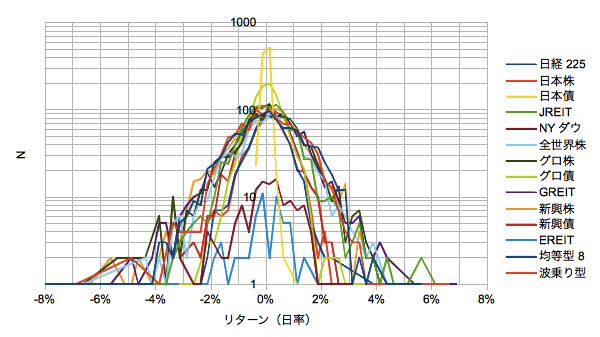 まず各資産の日次騰落率のヒストグラムを取ります。縦軸は特に規格化はしていません。