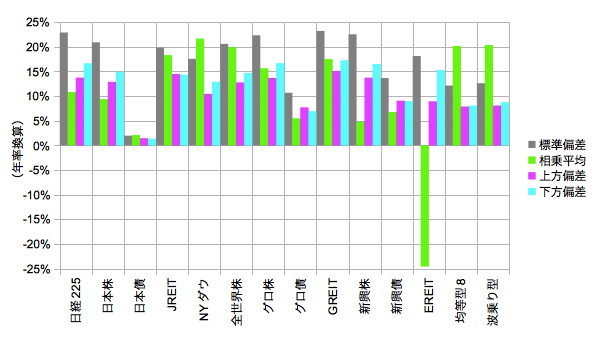 次にこの分布の統計量を求めます。横軸はeMAXISの各資産、縦軸は標準偏差、相乗平均、上方偏差、下方偏差です。日率を年率換算しています。