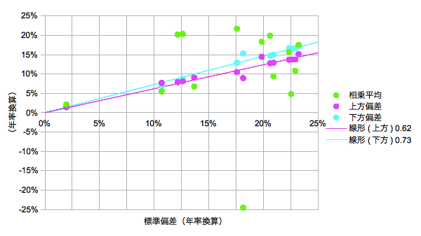 上方偏差も下方偏差も標準偏差なので相乗平均を用いるより標準偏差に対する相関が強いです。縦軸を期待リターンとみなすと原点に対する傾きがシャープレシオに相当します。
