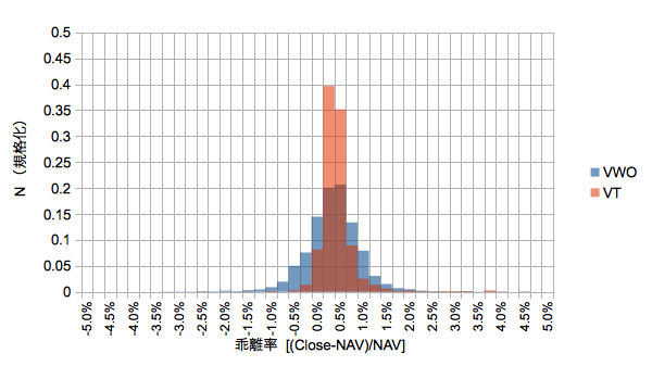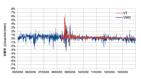 VWOとVTの基準価額と取引価格とのカイリを同じグラフにプロットしてみます。
