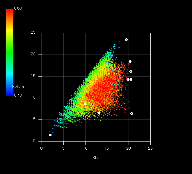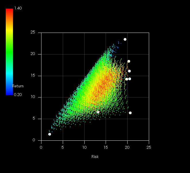 うーん、高コストの赤い点では有効フロンティアを満たせないではありませんか(´~`;)統計量をサンプリングするタイミングによってこのように偏りがあるのが痛いところです(JREITが頑張りすぎ)。ちなみに白玉は基準の9資産です。