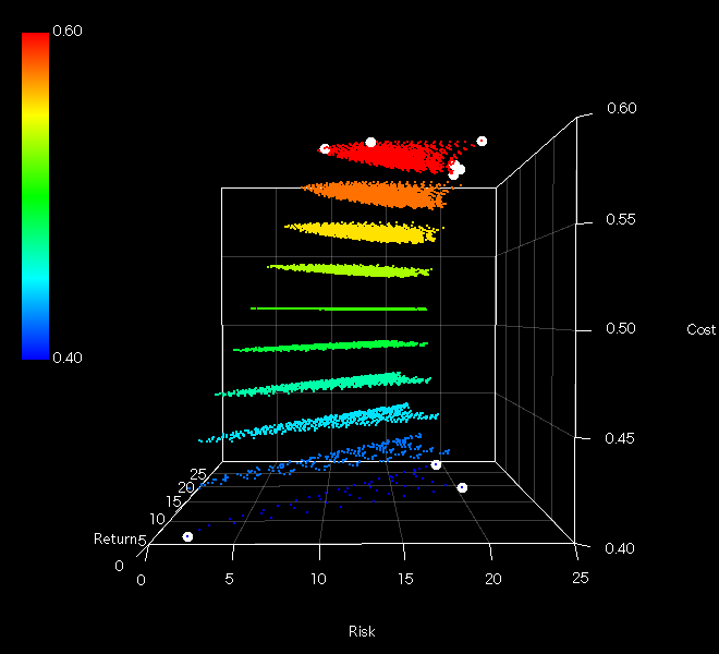 この図で左側にせり出した点がより効率的なポートフォリオになると思います(基準価額を用いたリスクリターンのためコストは含まれています。よってZ軸周りの角度(θ)がSRに相当すると考えられます)。この条件ではコストが中間準位くらいで三次元の極値があるようです。