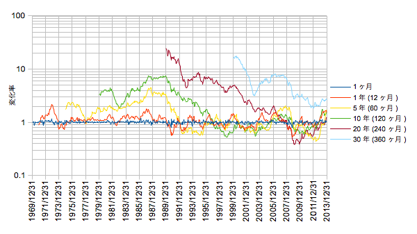 では前回と同じMSCI JAPANのデータを使って、各投資期間で資産がどう変動したかプロットしてみます。1969年末からのマンスリー変動率の時系列を基に12nケ月(n年)の移動の総乗(Π)を時間軸方向に求めます(期間固定で1ヶ月ずつずらす)。