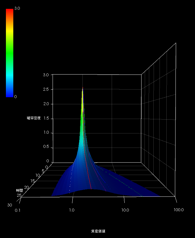 時間軸に対して垂直の平面から見ています。言わば未来から見た資産価値の確率分布になります。