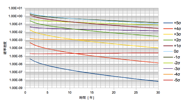 以前考えた「時間リスクの確率分布」では、n=10、20、30年といった特定の時刻で輪切りにした断面を二次元でプロットしていました。