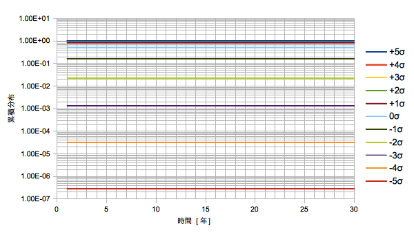 ・-2σ(95%)の白い線が30年経っても資産価値1を超えられていない(元本割れ)
