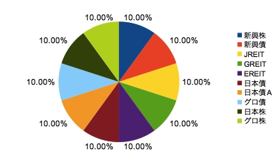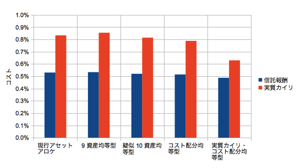自分の現行アセットアロケと、過去にいくつか考えた均等型ポートフォリオで加重平均コストがどうなるか確認します。コストの値は「