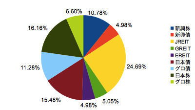 新興債や新興R等の割高な資産を混ぜれば全体のコストが上がることは自明です。これが分散投資や等配分の負の面と認識しています。このコストの割高さに対して①シグマ低減、②一極集中回避(リターン源泉の分散)に価値を見出だすことができるかは人それぞれです。①は新興国を混ぜてもシグマはなかなか減りませんが(´~`;)