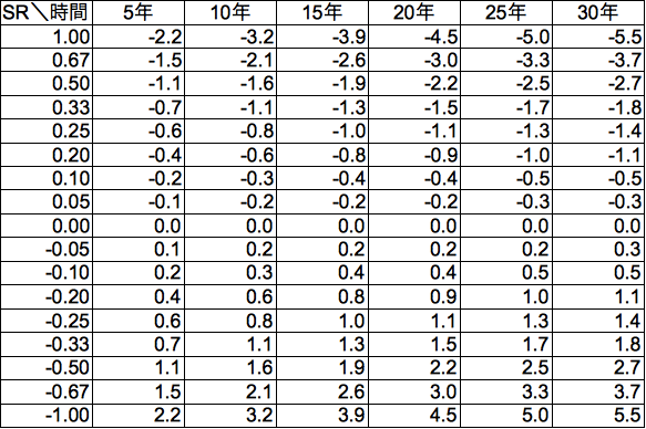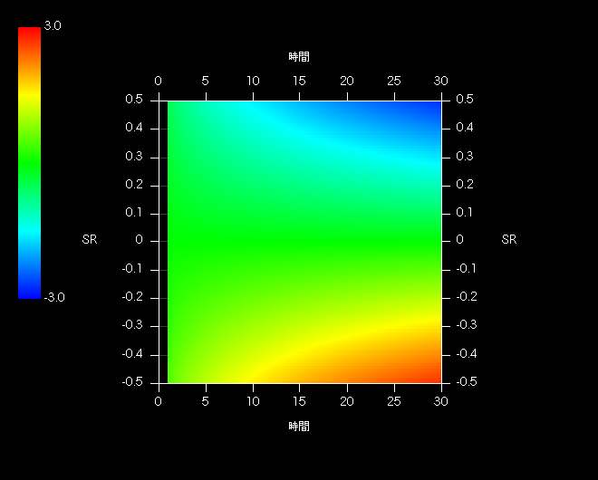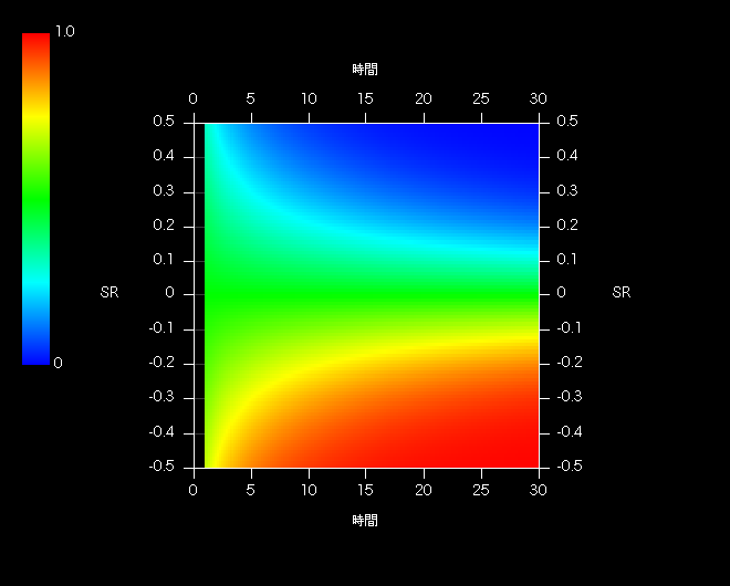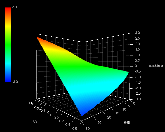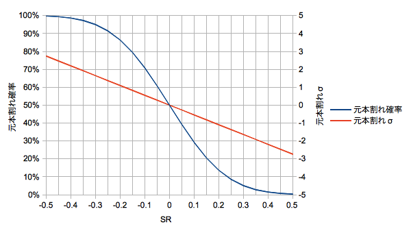 また平面図やテーブルからわかるように元本割れ確率はSR=0(相乗平均リターンがゼロ)を軸として対称(奇関数)です。