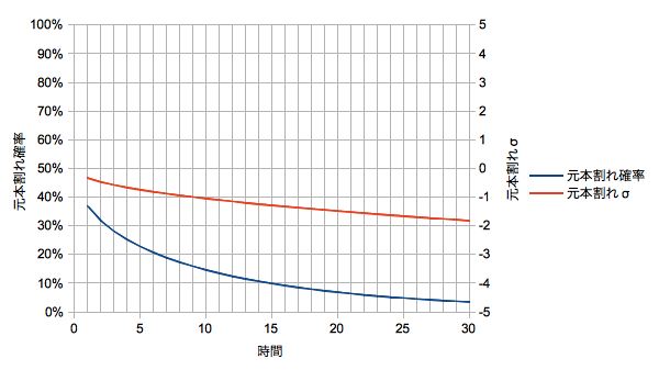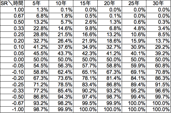 対数正規分布の考察から、元本割れ確率は時間とシャープレシオ(SR)のみに依存することがわかっています。