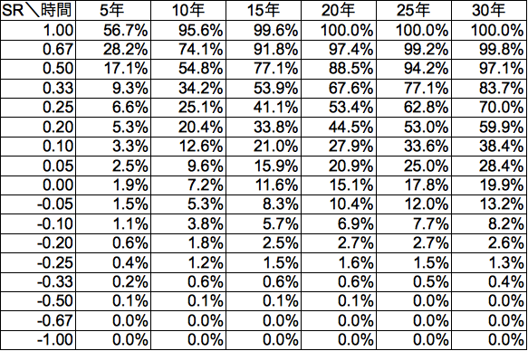 対数正規分布の考察から、2倍になる確率は時間とシャープレシオ(SR)とシグマに依存することがわかっています。