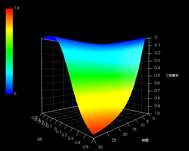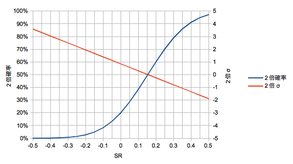 また元本割れ確率と違って2倍確率はSR=0を軸に対称ではありません。より大きなSRと時間が求められるという結果です。定量的にはSRは「μ/σ=ln2/(σn)」だけシフトします。