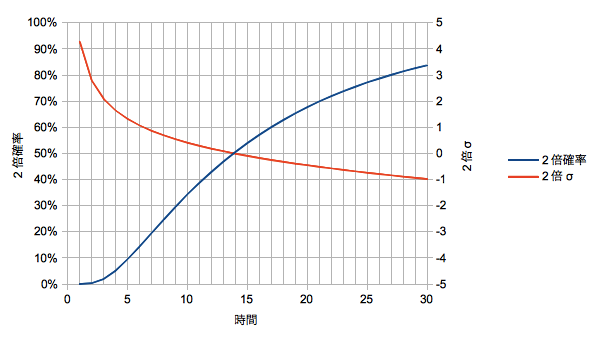 またSRが等しいときは「+ln2/(σ√n)」の項よりσが大きいほど2倍確率は高くなります。