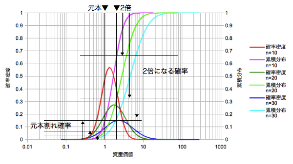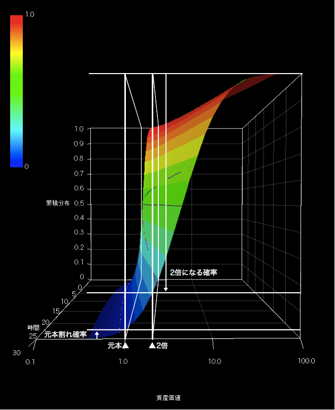 絵心が無くて恐縮ですが、白い線で囲った元本の平面および2倍の平面と、ある時間nにおいて交差する断面の高さがそれぞれ元本割れ確率および2倍になる確率に相当します。