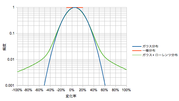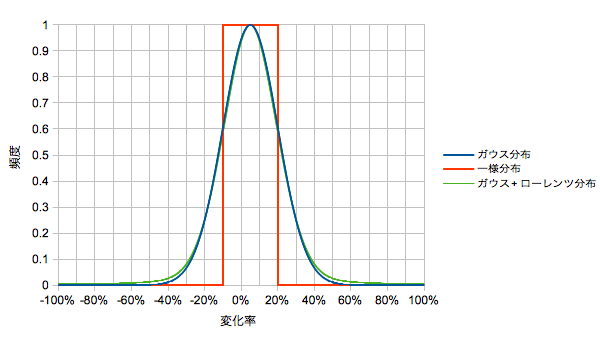 ③ガウス+ローレンツ分布:相加平均リターン=5%、シグマ=15%のガウス分布、中心=5%、幅=15%のローレンツ分布を8:2の重みづけでブレンド