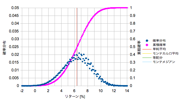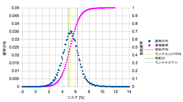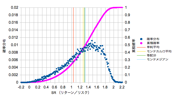 等配分はリスクにおいて中央値以上、リターンとSRにおいて中央値以下となりました。9資産が偏りをもってバラつくことで等配分の求める大数近似的な等リスク等相関という前提が成り立っていないためと考えられます。あるいは資産の偏りに対して相対的に近似のNが足りていないということだと思われます。(※元々時間リスクの対数正規分布とは異なるものを考えています。)