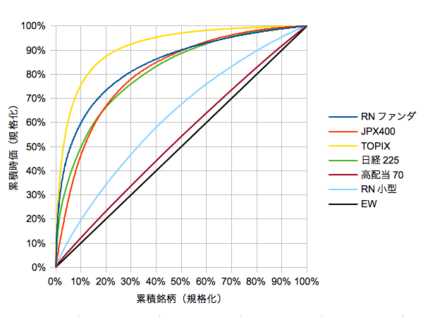 この図の意味は「上位X%の銘柄で時価Y%を支配している」ことを表します。例えばグリーンの日経平均は数で10%の銘柄が時価で50%に達していることがわかります。つまり最初の立ち上がりが急なほど少数の上位銘柄がウェイトの大部分を支配していることになり、実効的なNが減少している(分散が効いていない)と解釈できます。等配分で傾き1の直線になります。