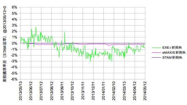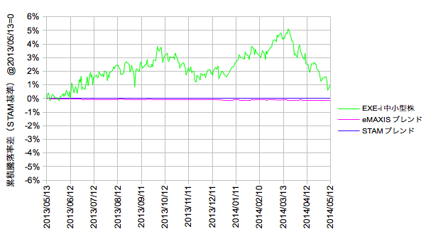 EXE-iの中小型株インデックスとeMAXIS/STAMの普通の時価加重インデックスでは投資対象、ウェイトの違うものを見ています。そのためか1年で最大5%ほどカイリがあるようです。