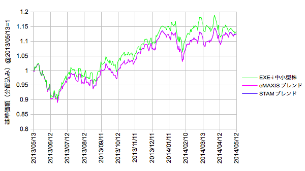 ・中小型株に対してはSTAM/eMAXIS日本株、グロ株、新興株を所定割合でブレンド(2013/05/13=1とした変化率の単純な加重平均)