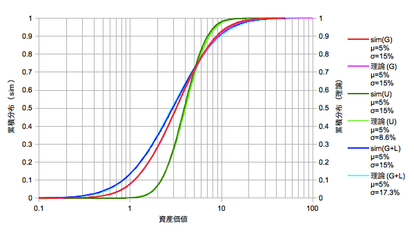 今回はまとめとして、simによる累積分布と、リスク分布乱数の標準偏差をシグマとした対数正規分布の理論的な累積分布とを比較します。