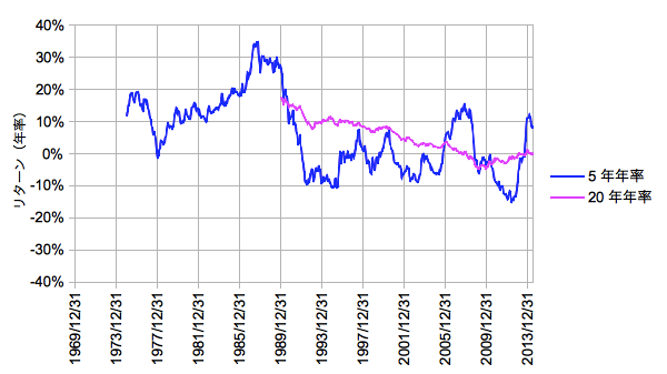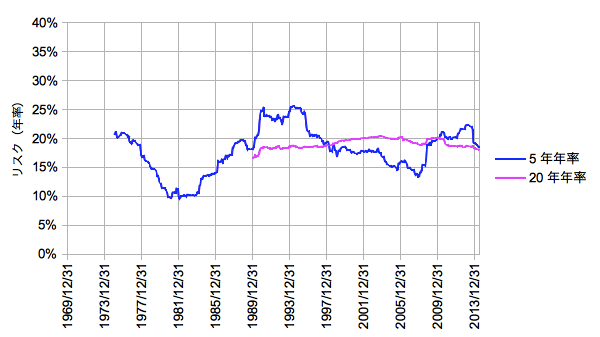 MSCI JAPANの1969/12/31から2014/06/30までのMonthly/Gross時系列をベースとしています。5年間および20年間の年率リスクリターンを求め、それを1ヶ月ずつ時間軸方向にずらしながらプロットしたものです。