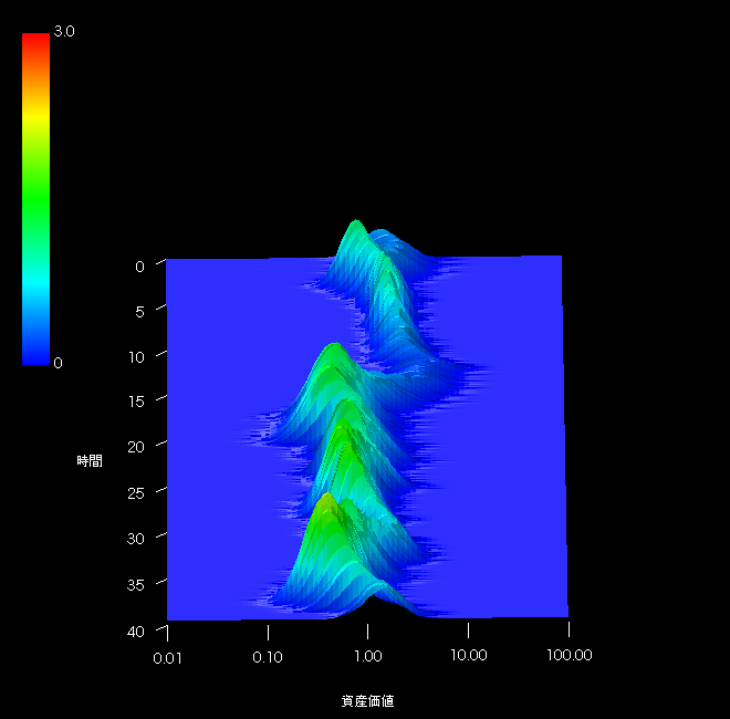 この海底山脈のような分布がリスクの時間変化を表します。MSCI JAPANの1969/12/31から2014/06/30までのMonthly/Gross時系列をベースとしています。5年間の年率リスクリターンから5年後の時間リスクの確率密度を求め、それを1ヶ月ずつ時間軸方向にずらして描画した474本(39.5年)のラスタースキャンです。ある時刻におけるスライス1枚1枚が確率密度に相当します。時間軸は1974/12/31をゼロとして年単位でスケールしています。
