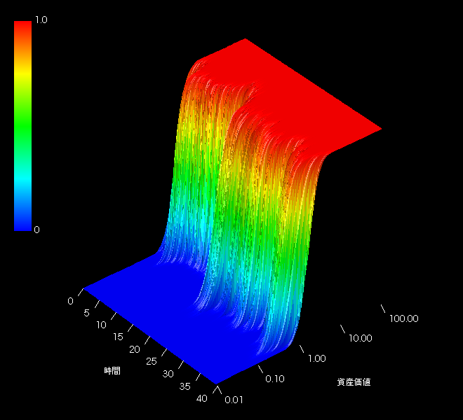 この大陸棚のような分布がリスクの時間変化を表します。MSCI JAPANの1969/12/31から2014/06/30までのMonthly/Gross時系列をベースとしています。5年間の年率リスクリターンから5年後の時間リスクの累積分布を求め、それを1ヶ月ずつ時間軸方向にずらして描画した474本(39.5年)のナイアガラです。ある時刻におけるスライス1枚1枚が累積分布に相当します。時間軸は1974/12/31をゼロとして年単位でスケールしています。