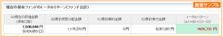「合計損益(トータルリターン)」=「現在の評価金額」+「累計解約金額」+「累計受取分配金額」ー「累計買付金額」