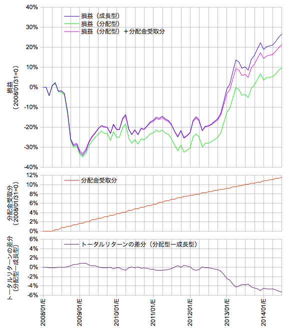 この図は、上段が基準価額から求めた損益率の推移、中段が分配型が払い出した分配金の累積、下段が分配型のトータルリターンから成長型のトータルリターンを差し引いたものです。ここで分配金は2008/01/31に対する率として表し、「損益(分配型)+分配金受取分」が分配型のトータルリターンに相当します。(※分配に対する課税、および再投資は今回の主旨と少しずれますし複雑になるので考慮していません。また成長型の2013/11/13の20円分配は微小量として含めていません。)
