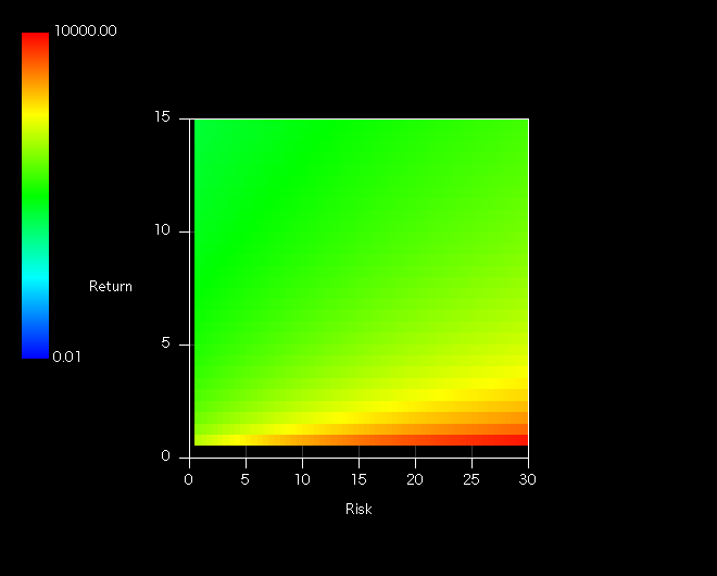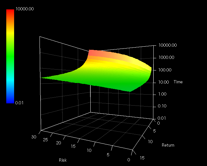 3Dは定量性が若干犠牲になりますが、パラメータに対する依存性が直感的に理解しやすくなります。ここでは時間がシグマとリターンによってどのように変化するかを示しています。Z軸はLogです。以下のコントアは上記三次元の平面版です。