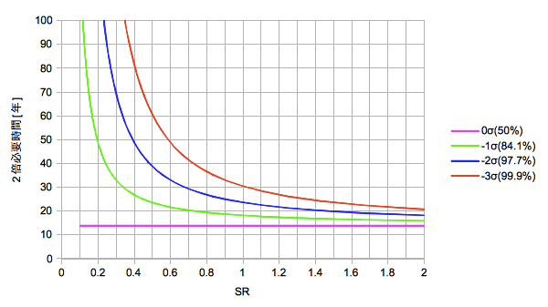 【2倍になるための時間のSR依存(μ=5%)】
