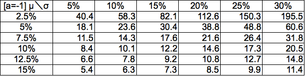 例えばμ=5%、σ=15%、-1σの確率(84.1%、a=-1)で2倍になるために必要な時間は
