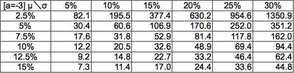 元本割れの場合と違い2倍になることをクリアする課題が加わるため、時間がオフセットを履くことになります。a=0の場合に相当する漸近線は定量的には「ln2/μ」となります。これは72の法則の解析的な形であり、上記a=0のテーブルが72の法則で求められる値とほぼ一致します。