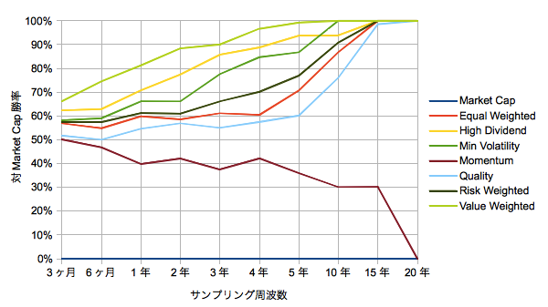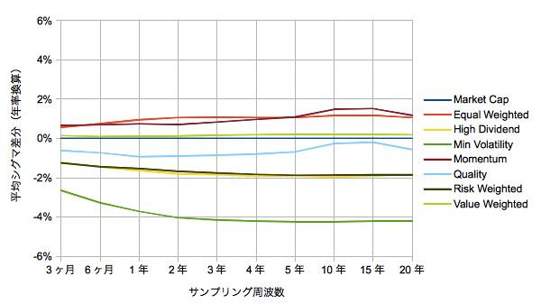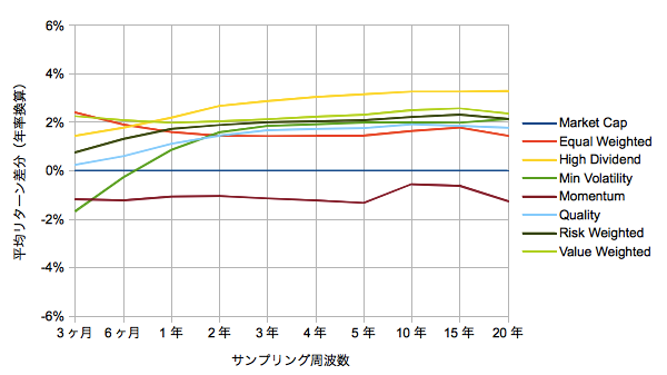 その他の非時価インデックスの傾向は世界株の場合とほぼ変わりません。モメンタムと違い「失われた20年(?)」のようなその時々の状況に依存しにくい点は合理的だと思います。