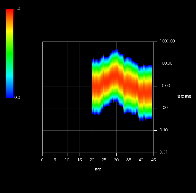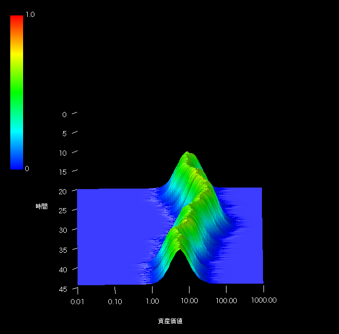 数学的に書けば、「累積分布=∫確率密度・d(資産価値)」の積分の中身「確率密度・d(資産価値)」をZ軸にプロットしたものです。