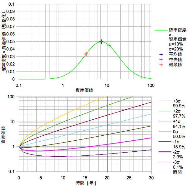 上段が今回の「確率密度×資産価値」版ラスタースキャンの断面に相当する図(積分して1になるように規格化)、下段が通常の「時間リスク」の図です。