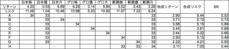 3資産以上という制約があるので新興国リートを含む3資産の組み合わせで8本の式を立てます。