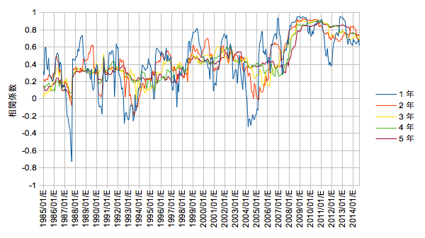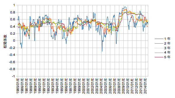 特に「1年」の線を見ると1~2年周期で上下動を繰り返しています。前回の米ドルと日本株との場合と異なりサブプライム・リーマンでも相関の変化は大きくないように見えます。これはあの時の変化の支配的な要素が為替だったことを示していると考えます。