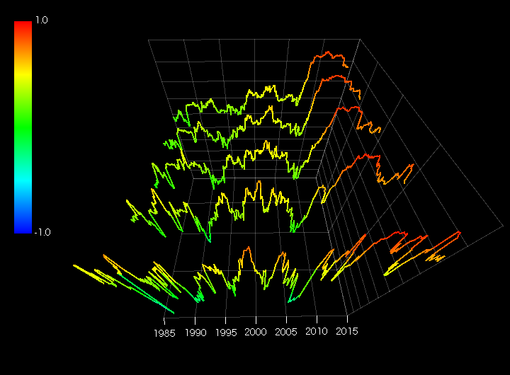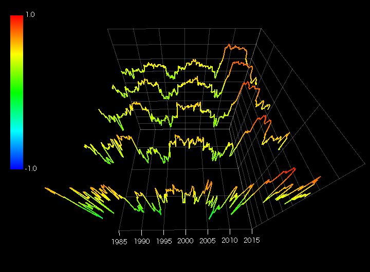 日本株指数であるMSCIジャパン(円建て)とグロ株指数であるMSCIコクサイ(米ドル建て)との相関を時系列で見たものです。タップ期間(計測期間)を1~5年で可変にして周波数依存を求めています。3D図は奥行き方向に期間が長くなっています。