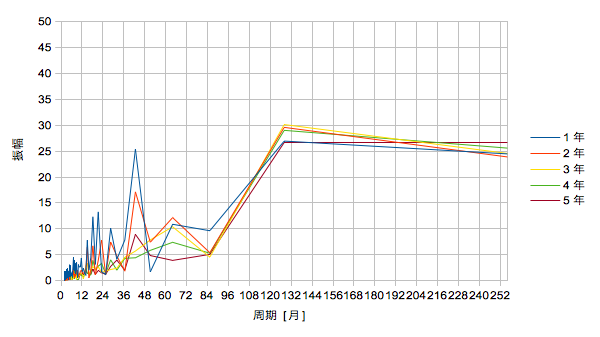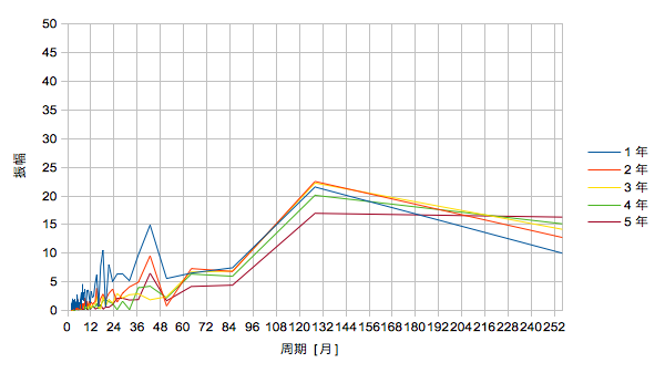 以下は上記をフーリエ変換して周波数空間に置き換えたものです。横軸は周波数を周期で表しています。FFTのため時間的に新しい方から2^n=256ヶ月分をサンプリングしています。