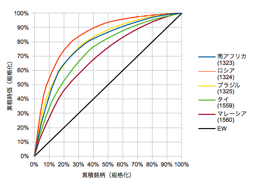 この図の意味は「上位X%の銘柄で時価Y%を支配している」ことを表します。例えばブルーの南アフリカは数で10%の銘柄が時価で40%に達していることがわかります。つまり最初の立ち上がりが急なほど少数の上位銘柄がウェイトの大部分を支配していることになり、実効的なNが減少している(分散が効いていない)と解釈できます。等配分で傾き1の直線になります。