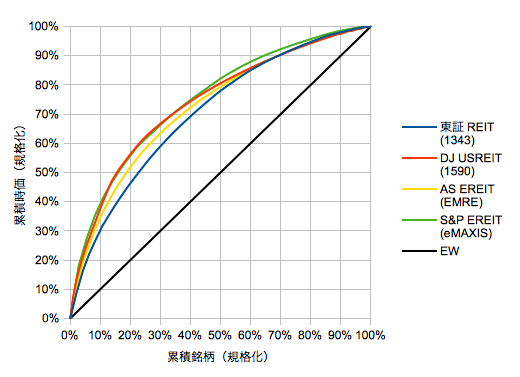 この図の意味は「上位X%の銘柄で時価Y%を支配している」ことを表します。例えばブルーの東証REIT指数は数で10%の銘柄が時価で30%に達していることがわかります。つまり最初の立ち上がりが急なほど少数の上位銘柄がウェイトの大部分を支配していることになり、実効的なNが減少している(分散が効いていない)と解釈できます。等配分で傾き1の直線になります。