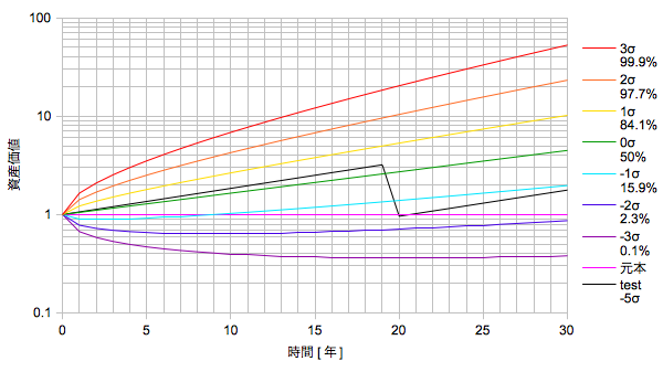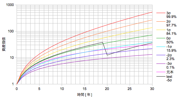この例では「途中までいい感じだったのに-2σ前後まで暴落してしまった。そこからなんとか持ち直したが30年目で見ると結局-1σ程度の確率で起こりうる事象だった」という風に自分では解釈しています。つまり暴落に遭遇してしまったら「それが-2σの確率だった」と受け入れるしかありません。それを承知でリスクを取っているからです。