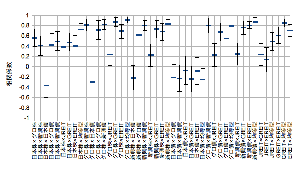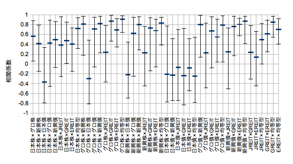 eMAXIS新興債開始の2010/09/13~2014/11/28。時系列上の20日移動相関係数の平均値をセンターとし、エラーバーにはその標準偏差とマックスミニマムを採用。新興RT(2013/11/18~)と均等型(2011/10/31~)はそれぞれの設定日から。