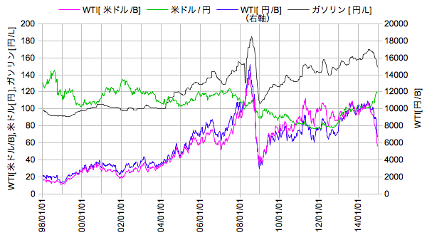 原油価格は米国EIAのWTI、ガソリン小売価格(レギュラー、全国平均)は資源エネルギー庁からもらってきます。円換算の為替は日銀の米ドル円をもらってきます。為替で律速する1998/01/12から2014/12/22までのweekly。
