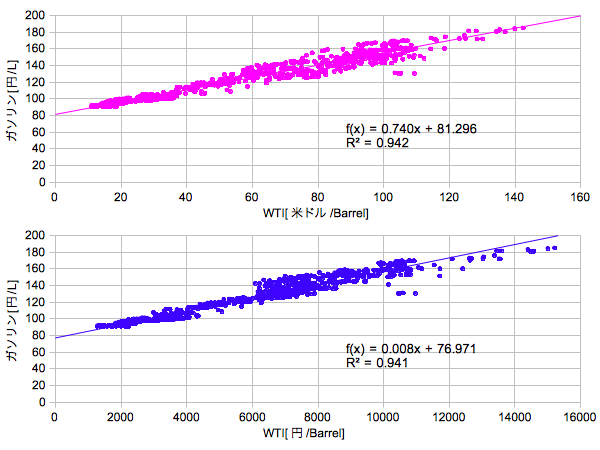 こうやって見るとガソリン価格というものはほとんどWTIと同じです。これを時系列ではなく散布図にしてみます。
