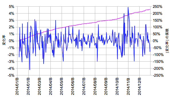 以下は「ニッセイ日経225」の2014年の1日当たりの変化率とその絶対値の累積です。