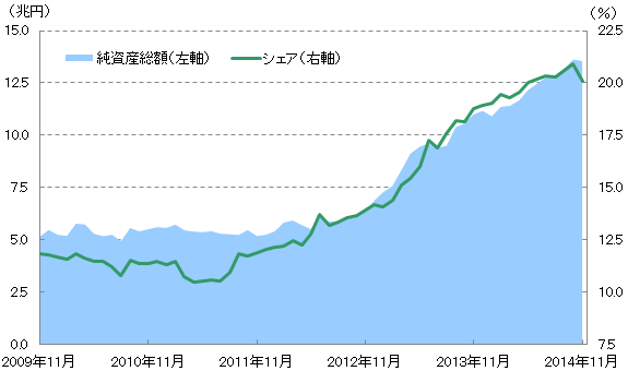 ここ1年くらいスタムやイーマックスの純資産の増え方がすごいなあと思っていましたがさすがに想像外です。個人的な願いとしてはインデックスのシェアはMacと同じくらい(10%くらい?)でいてほしいと思います。しかしコストや成績の関係で放っておいても長期的にインデックスのシェアは広がるのだと思います。