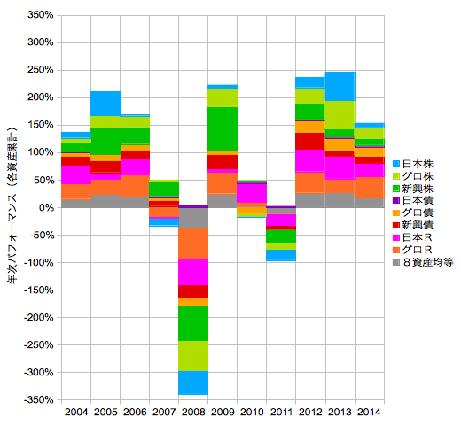 「バランスファンドは1番にはなれない!?」のタブをご参照ください。「複利ではない」という注意書きがあるので単年の相加平均リターンの「ツイストグラフ」です。(※余談ですが「このような悩みをお持ちのお客さまに…」のタブに8資産均等型の通貨別割合が載っています。)