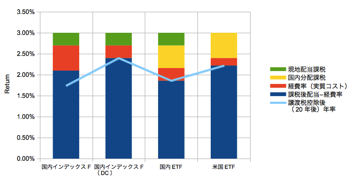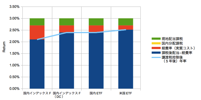 ・国内インデックスFは現地配当課税10%、無分配を仮定して国内分配課税はゼロ。